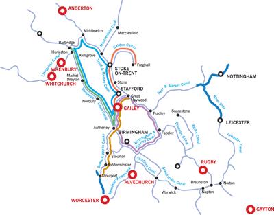En fascinerande resa med mycket att se och väl värt mödan! Resan går längs den lantliga Straffordshire och Worchester kanalen till Great Haywood junction där man går förbi en mycket speciell bro, nu börjar "Trent & Mersey" kanalen och vi viker av norr ut mot Potteries and Peak district. längs det vackra Staffordshire landskapet kommer vi så småningom till "Stoke on Trent" och den långa Harecastle tunneln efter tunneln kommer en sträcka på ca 20 km som har hela 31 slussar till Cheshire Plains.